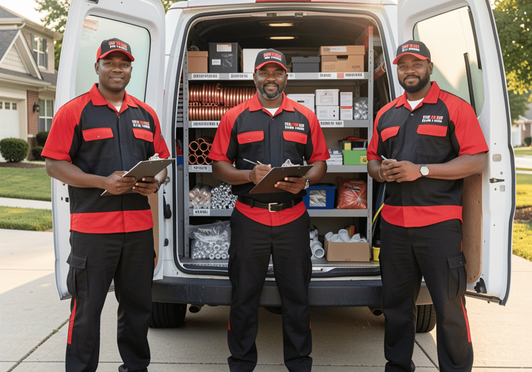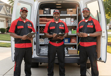 π¨πΎβπ§ Professional technicians in crisp red and black uniforms you can easily recognize and feel comfortable with.