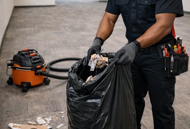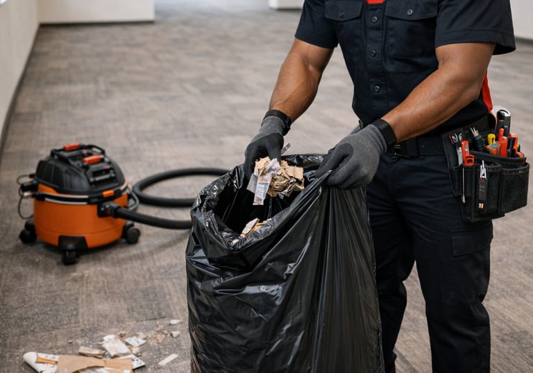 Remove leftover tenant debris from previous build‑outs or repairs (small loads), sweep/vacuum work areas, and leave the space presentable for professional cleaning or immediate showings.
