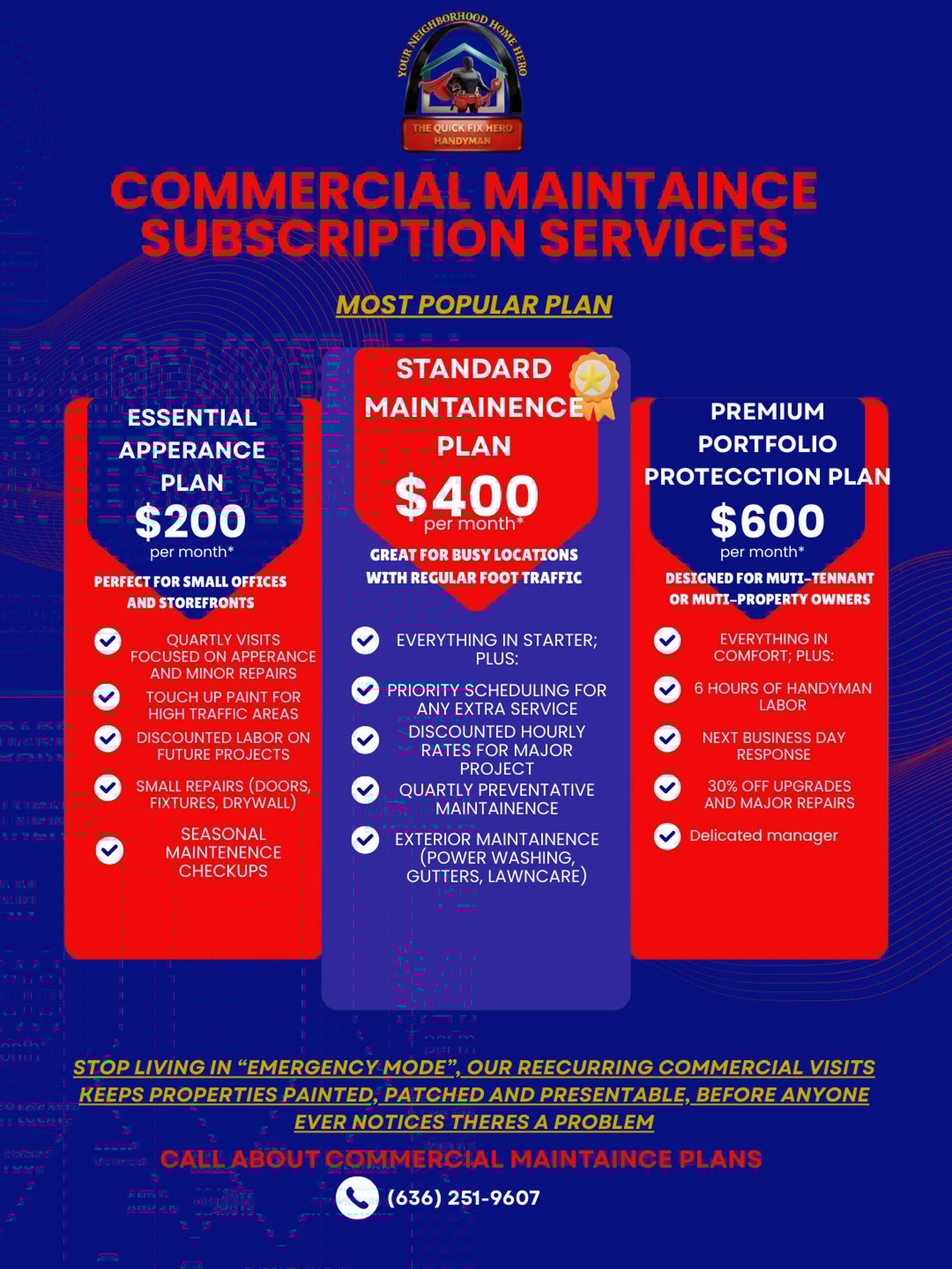The Quick Fix Hero provides reliable, professional commercial maintenance and repair services for offices, retail spaces, restaurants, and multi‑unit properties across the St. Charles and St. Louis metropolitan area.